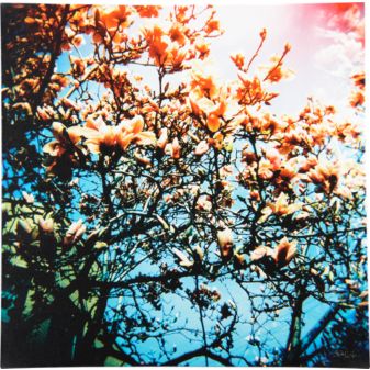 full bloom. Something clicked for Chicago multimedia artist Bret Grafton when he walked under a magnolia tree one day. He captured its beauty with Holga, a medium format 120-film toy camera. Spring-like reverie resonates in a bubblegum haze of peach, pink and blue. Low-fi aesthetic rings with quiet harmony on archival UV-protected canvas print mounted on a recycled wood frame. Artist's signature on front, bio on back.